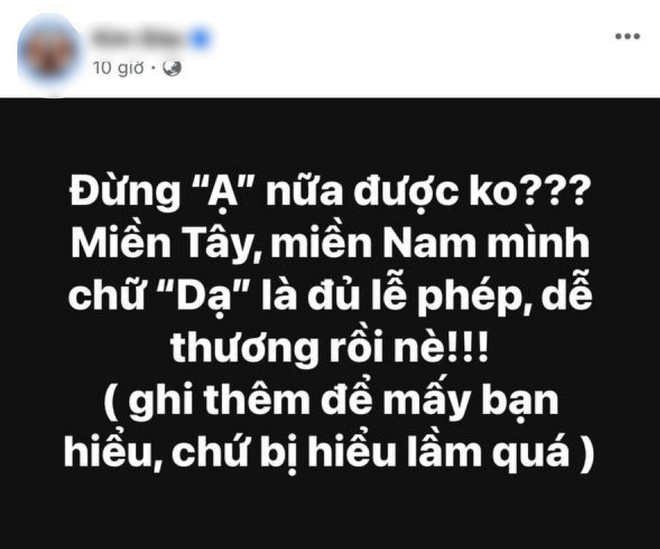 Mới đây, một topic xoay quanh vấn đề câu cú thể hiện phép lịch sự trong giao tiếp hàng ngày khiến dân tình quan tâm, tranh cãi gay gắt. Cụ thể, có người đưa ra quan điểm rằng: "Đừng 'Ạ' nữa được không? Miền Tây, miền Nam mình chữ "dạ" là đủ lễ phép, dễ thương rồi nè!".