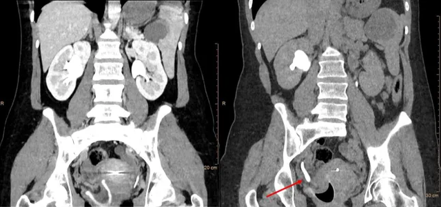 Bởi vì khi tới bệnh viện, Sarah cũng chỉ cho rằng mình bị sỏi thận tái phát. Nhưng kết quả chụp cắt lớp tiết niệu khiến các bác sĩ bất ngờ: thận phải và niệu quản của cô bị sưng đáng kể, với đường kính giãn nở lên đến 22mm. Nguyên nhân được xác định là do cốc nguyệt san đặt sai vị trí, vô tình chặn đường lưu thông của nước tiểu. Điều này dẫn đến hiện tượng ứ nước thận, gây nhiễm trùng và đau đớn kéo dài.