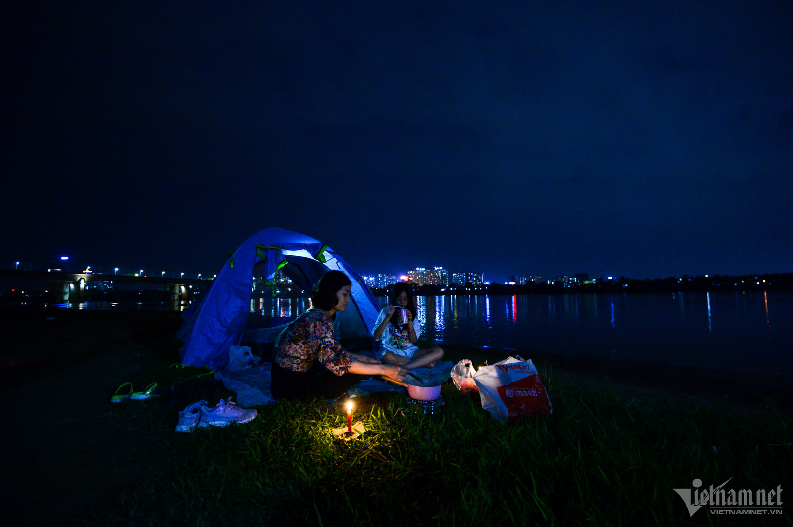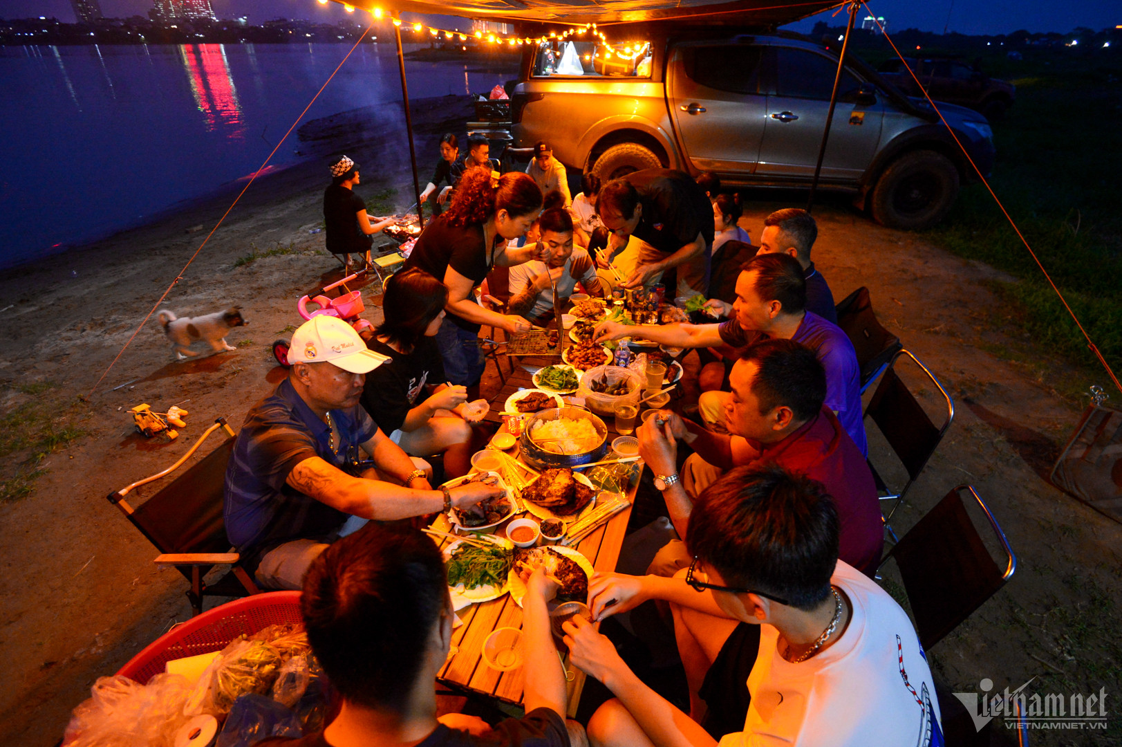 18h30, mặt trời đã khuất bóng, các gia đình nhóm bếp, đun nước chuẩn bị cho bữa tối. Ngoài lều nhỏ có tính di động cao, nhiều nhóm mang theo bạt lớn và đèn trang trí. Họ chọn những khoảng đất xa phía bờ sông hơn để có không gian vui chơi, tránh tình trạng đông người xung quanh.