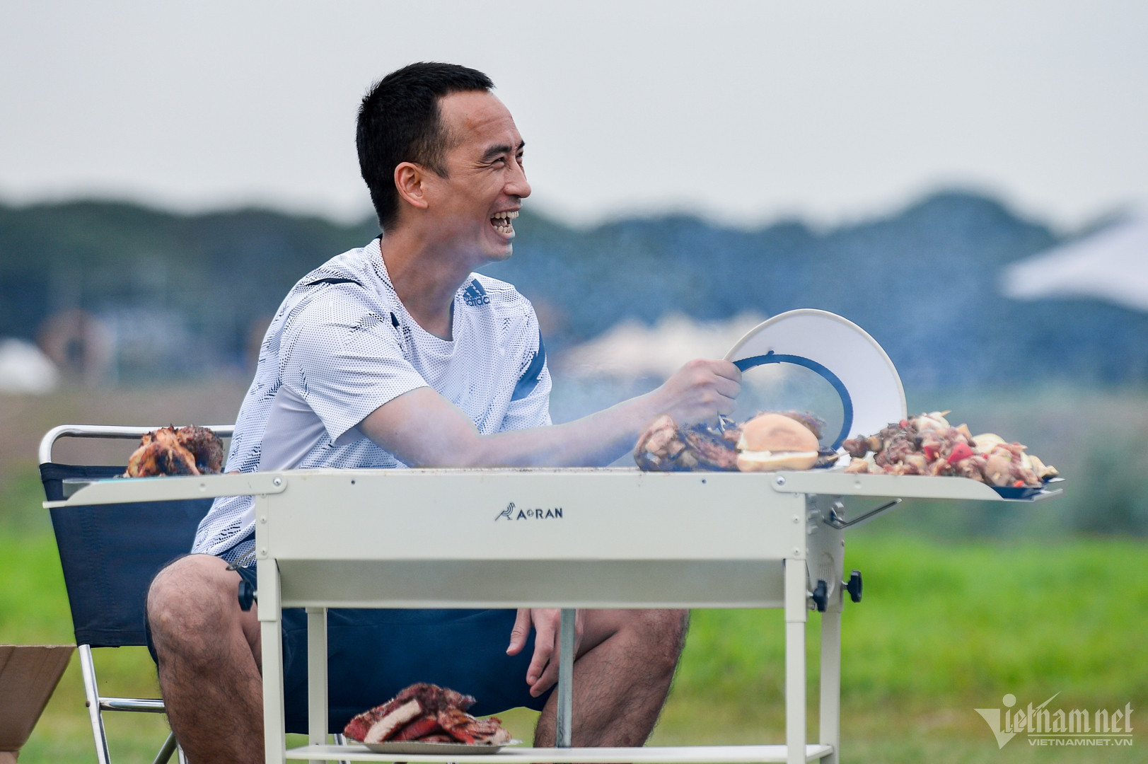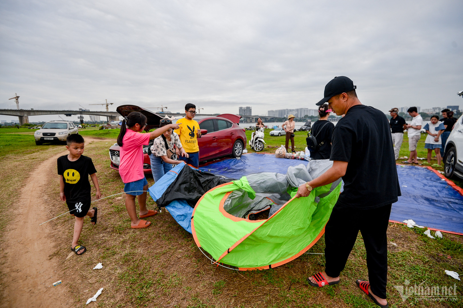 Cảnh tương tự tại bãi sông Hồng gần chân cầu Vĩnh Tuy, một điểm dã ngoại mới nổi vài năm gần đây.