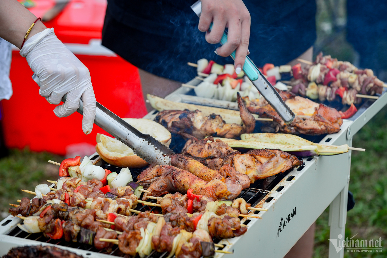 Thịt xiên, gà, xúc xích nướng... là các món ăn dễ chế biến được nhiều gia đình lựa chọn cho buổi tối mát mẻ ven sông.