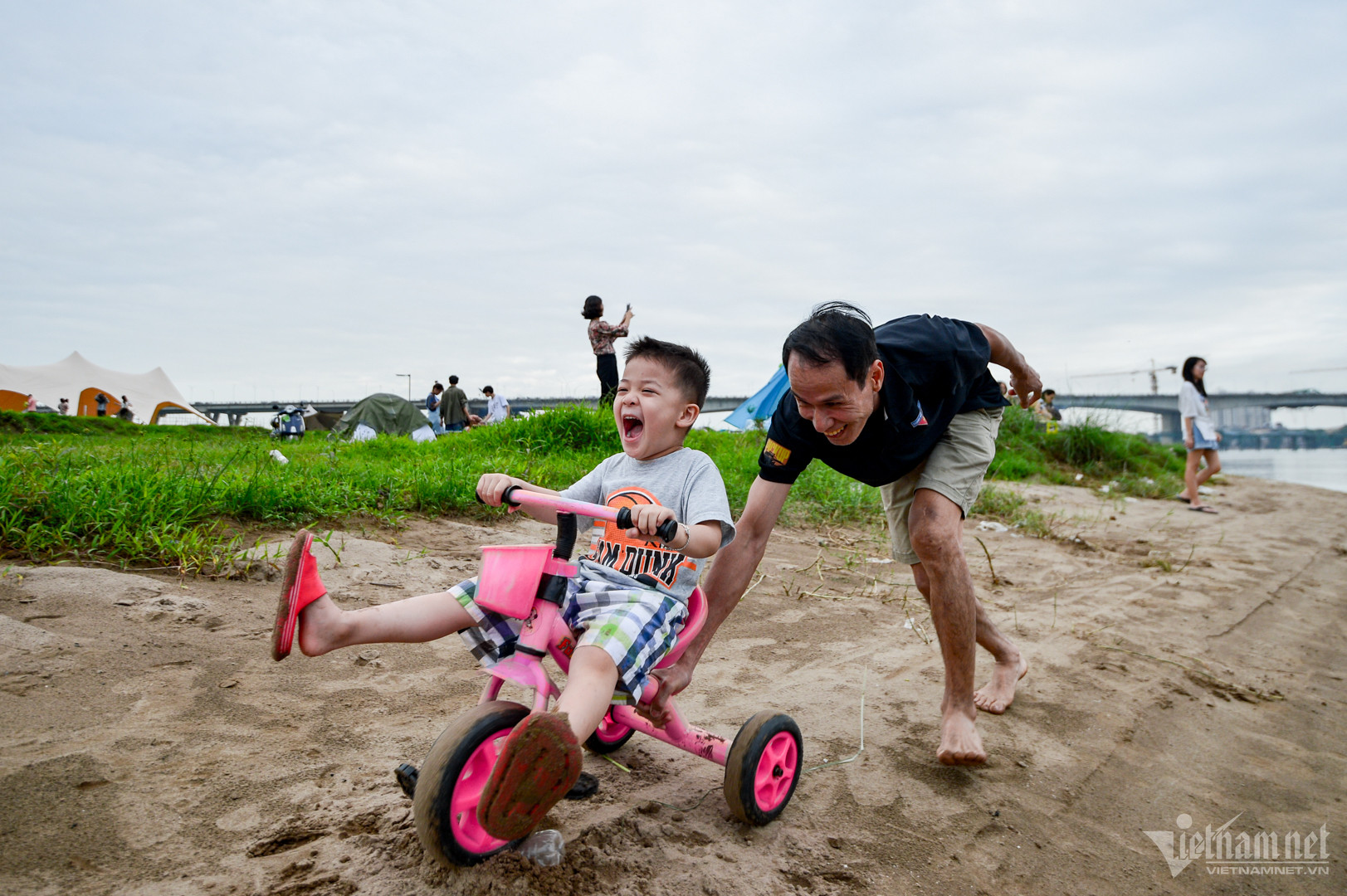 Bãi đất ven sông Hồng cách nhà anh Vũ Mạnh Cường khoảng 5km. "May mắn hôm nay không quá đông, thậm chí còn vắng hơn cả cuối tuần nữa. Nhưng như vậy cũng thích hơn vì các con được vui chơi thoải mái. Lều trại được dựng xa nhau giúp bớt sự ồn ào hơn", anh nói.
