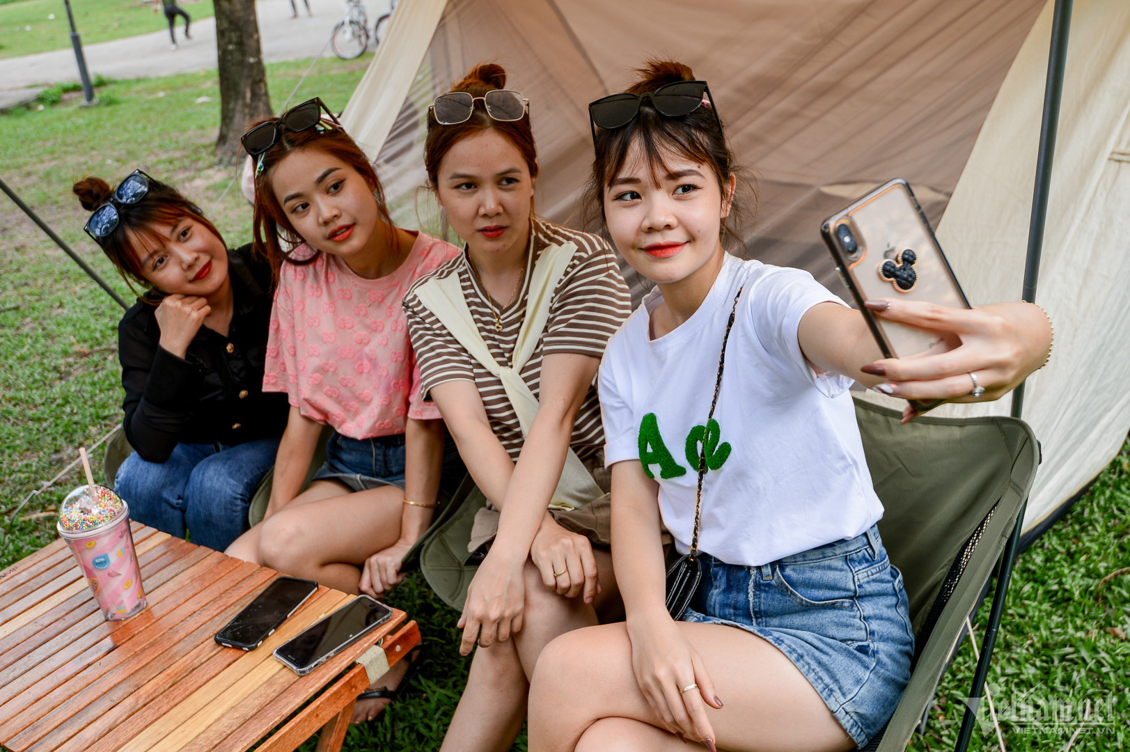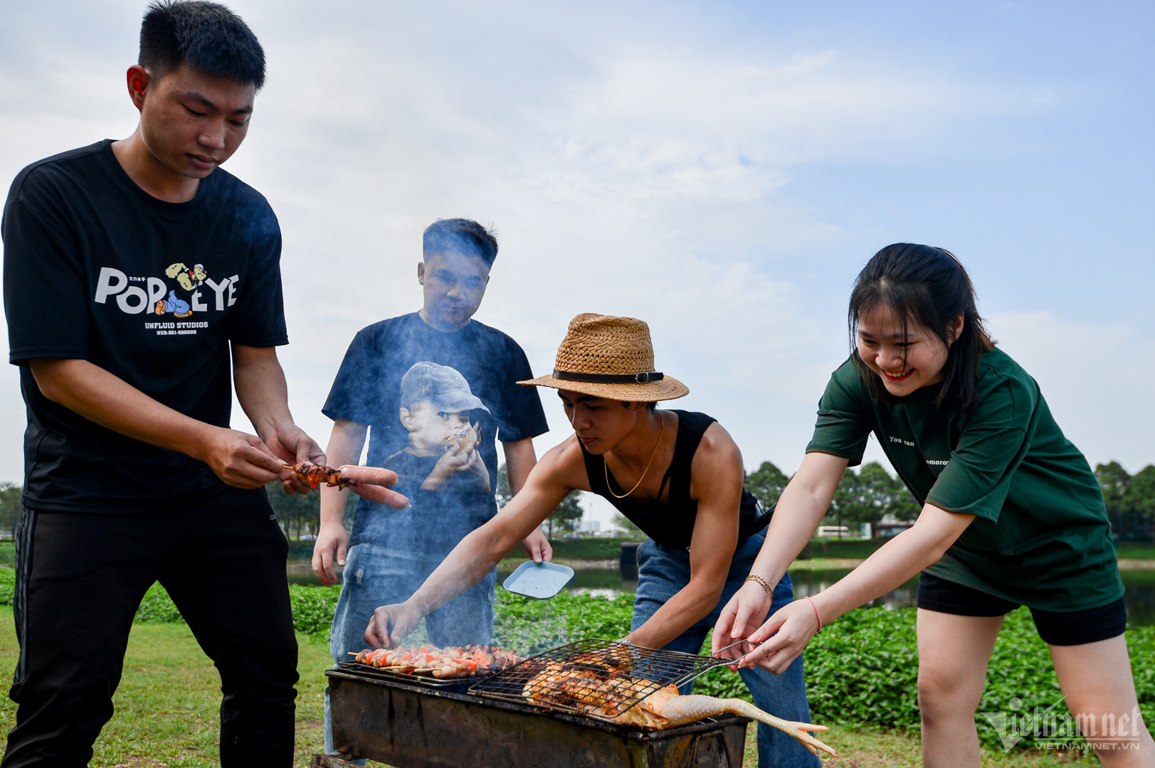 "Sáng nay có mưa nhỏ, em tưởng chừng như phải dời kế hoạch nhưng may mắn là buổi chiều hửng nắng. Chỉ cần một cuộc gọi là chúng em đã tụ họp đông đủ. Đứa mang bếp, đứa mang bạt, thức ăn thì toàn đồ sẵn nên việc chuẩn bị không mất nhiều thời gian", bạn Nhàn (đại diện nhóm) chia sẻ.