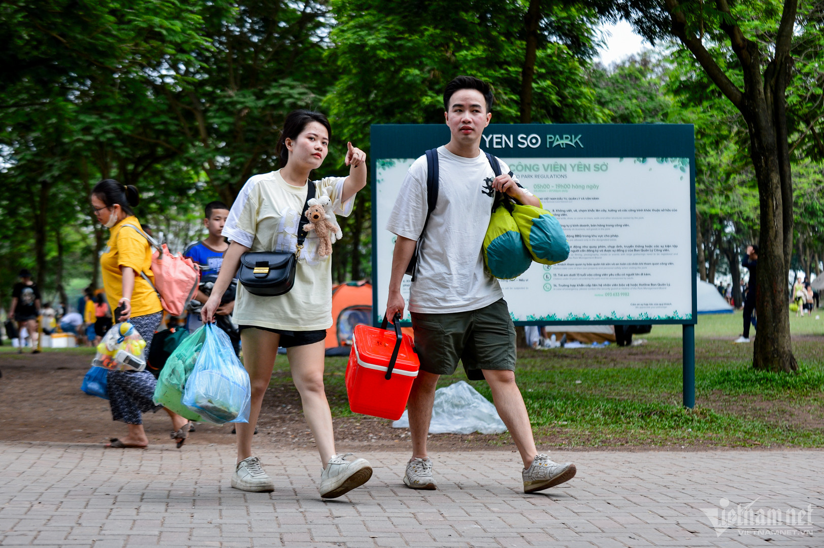 Khu vực bãi đất vui chơi chật kín người. Công viên Yên Sở chỉ mở cửa phục vụ đến 19h, do đó từ 17h đã có một vài nhóm thu dọn ra về.