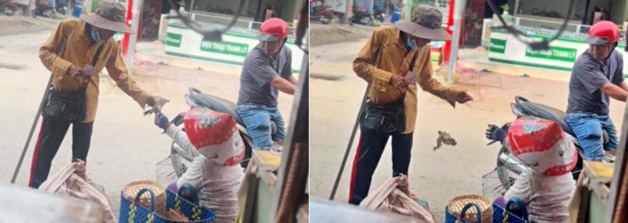 Sau ít phút trao đổi, ông cụ đề nghị người bán thả tự do cho những con chim. Lúc đầu, người phụ nữ tỏ vẻ nửa tin, nửa ngờ. Nhưng khi thấy cụ ông thuyết phục mua bầy chim sẻ với giá 900.000 đồng, người phụ nữ mở cửa lồng, bắt từng con chim rồi thả chúng bay đi.
