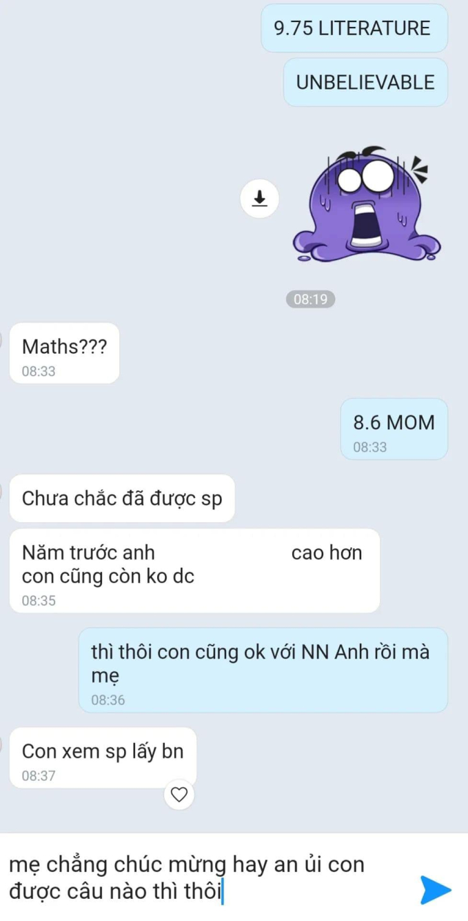 Đi kèm với bài đăng là một bức ảnh chụp màn hình tin nhắn của bạn học sinh này với mẹ. Lúc đầu bạn có nhắn 9,75 literature (ý chỉ được 9,75 môn Ngữ văn trong kỳ thi tốt nghiệp THPT 2024) và điều này khiến bạn "unbelievable" (không thể tin được). Đáp lại, người mẹ chỉ nói một câu rất ngắn "math???", ý hỏi bao nhiêu điểm môn Toán và bạn trả lời: "8,6 mom" (8,6 mẹ ạ).