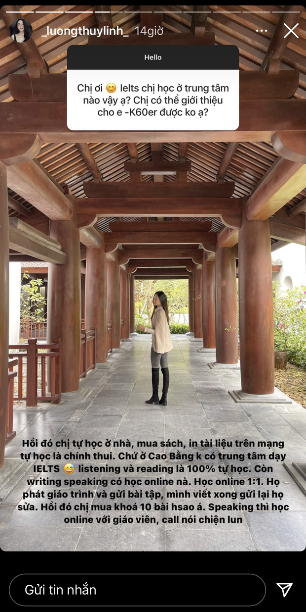 Trên trang cá nhân, Hoa hậu Lương Thùy Linh tích cực tham gia Q&A, thẳng thắn trả lời thắc mắc của người hâm mộ. Nàng hậu không ngần ngại giải đáp kỹ càng khi được hỏi: "Chị ơi, chị học IELTS ở trung tâm nào vậy? Chị có thể giới thiệu cho em - K60er được không ạ?".