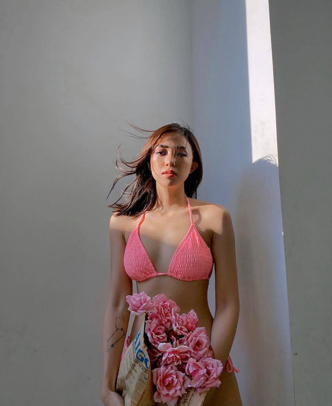 Salim với bộ bikini 2 mảnh màu hồng phấn như phong cách nữ tính thường thấy. Chẳng cần ra biển mà chỉ với bó hoa và chút nắng cũng có ảnh xịn nhé!