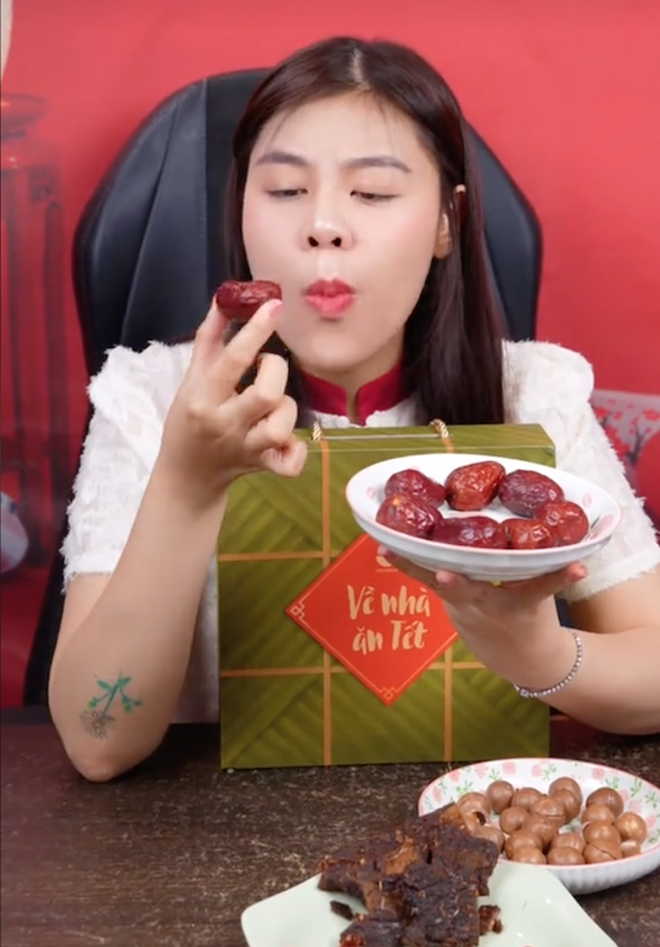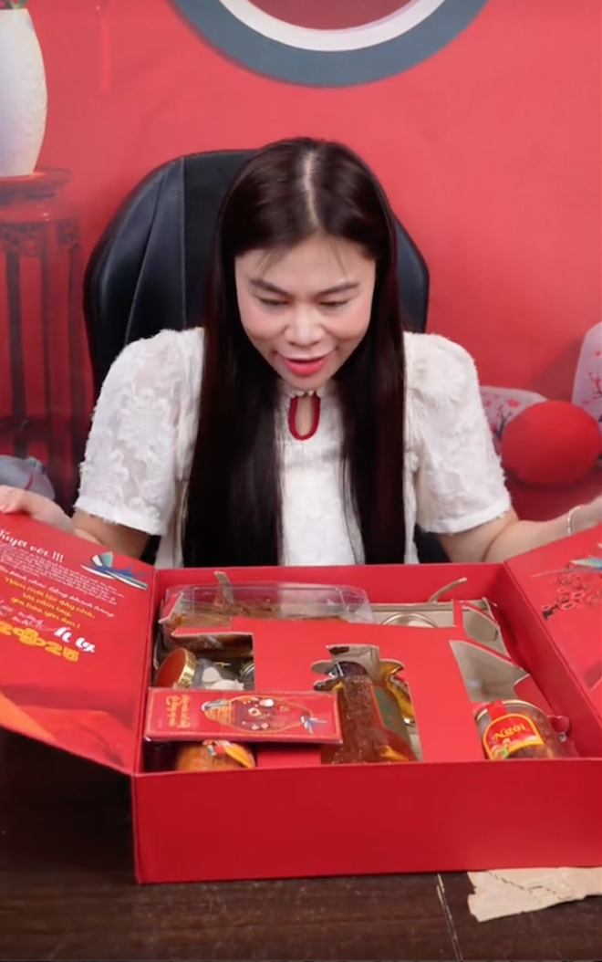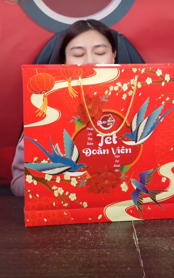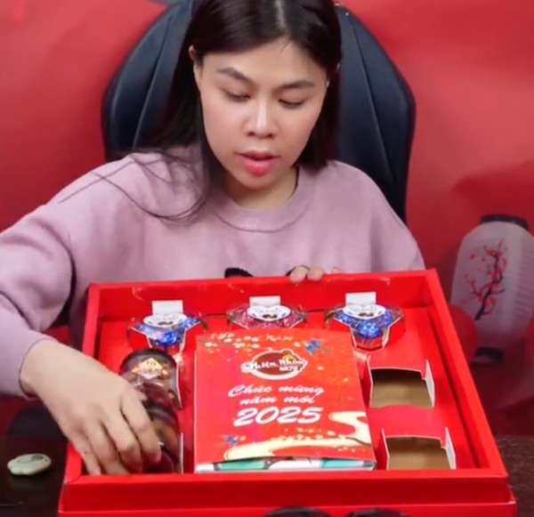 Bà Nhân Vlog cũng đã góp mặt vào "đường đua" giỏ quà Tết năm nay. Với mức giá 950k, sản phẩm này khiến TikToker @phuongoanh.daily hơi thất vọng vì khi ship đến tay thì bên trong đã bị gãy khiến các sản phẩm bị dịch chuyển lẫn lộn, không còn đẹp mắt nữa. Bù lại thì hương vị của các món bên trong nhận được lời khen. Tuy nhiên, các cư dân mạng lại cảm thấy hơi lấn cấn khi mua sản phẩm này đi tặng dịp Tết bởi bên trong có mực.