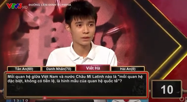 Khi soi lại trong chương trình, chúng ta cũng thấy được việc thi đấu không tốt của Viết Hà ở phần Khởi động. Khoảng 30 giây đầu (tương đương nửa phần thi), nam sinh này không giành được bất kì điểm nào.