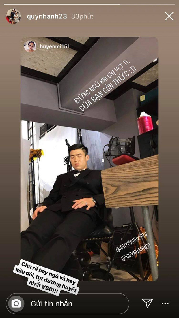 Trước đó chiều 3/1, Quỳnh Anh chia sẻ hình ảnh Duy Mạnh khi đi chụp ảnh cưới. Chú rể tương lai tranh thủ ngủ gục trên ghế vì quá mệt. Cô vợ sắp cưới "tố" cầu thủ người Đông Anh: "Chú rể hay ngủ và hay kêu đói, tụt đường huyết nhất Vịnh Bắc Bộ".