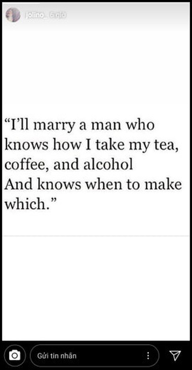 Mới đây, em gái Ông Cao Thắng bất ngờ chia sẻ quan điểm về người mình muốn lấy làm chồng qua một đoạn quote ngắn: "I'll marry a man who knows how I take my tea, coffee, and alcohol. And knows when to take which" (Tạm dịch: Tôi sẽ cưới một người đàn ông biết tôi uống trà, cà phê và rượu như thế nào. Và biết khi nào thì tôi uống thứ gì).