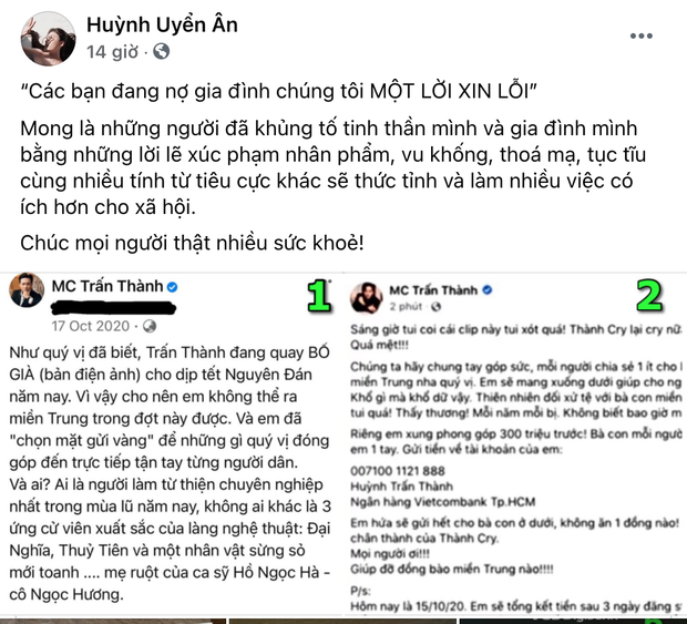 Dễ thấy, ngoài việc bảo vệ anh trai, cô út cũng hé lộ gia đình Trấn Thành đã và đang bị khủng bố tinh thần bởi những lời lẽ xúc phạm rất nhiều. Song song với đó, Huỳnh Ân cũng nhắn nhủ những ai đang công kích gia đình mình nên thức tỉnh và làm nhiều việc có ích cho xã hội.