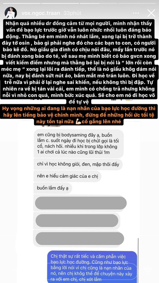 Story của Võ Ngọc Trân nhận được rất nhiều phản hồi đồng cảm và chia sẻ về những trải nghiệm tương tự như từng bị bắt nạt, bị tẩy chay... Ngoài những dòng trạng thái trên story, Võ Ngọc Trân còn cho biết thêm, em trai mình bị đánh nhưng vì sợ nên phải nói dối gia đình là bị ngã.