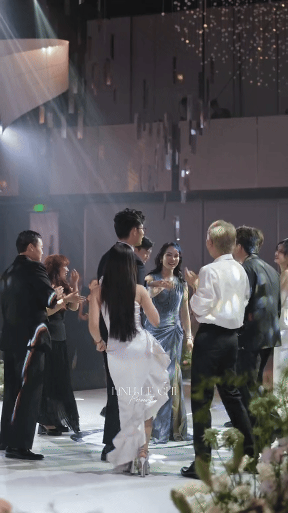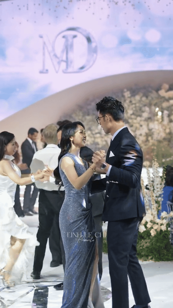 Trong giây phút này, cặp đôi khiêu vũ cùng với các khách mời nhưng vẫn cực cuốn vì thần thái và ánh mắt ngọt ngào dành cho nhau. Đặc biệt Minh Khoa còn bế bổng vợ lên giữa sàn nhảy, không chỉ thể hiện tình cảm với vợ mà còn cho thấy cặp đôi đã quá quen thuộc với những buổi khiêu vũ thế này.