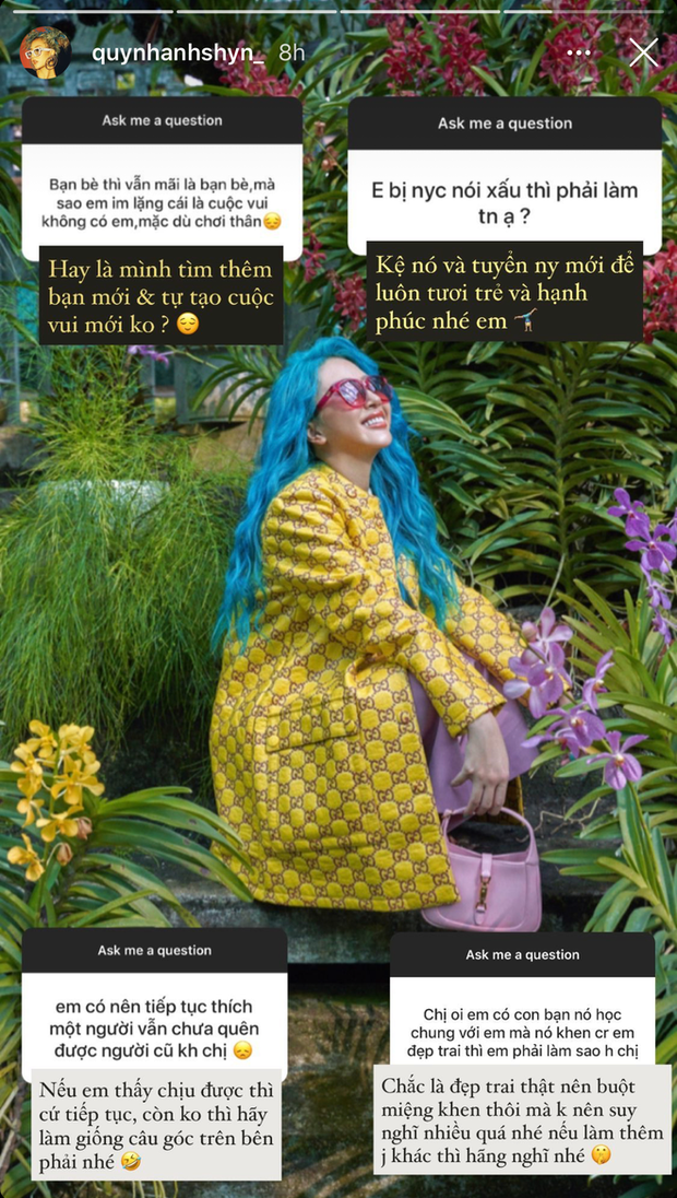 Cụ thể, một fan đã hỏi Quỳnh Anh Shyn phải làm sao khi bạn bè thì vẫn là bạn bè nhưng chỉ cần mình im lặng, các cuộc vui sẽ không có mình nữa. Đáp án được Quỳnh Anh Shyn đưa ra chính là "tìm thêm bạn mới và tự tạo cuộc vui mới".