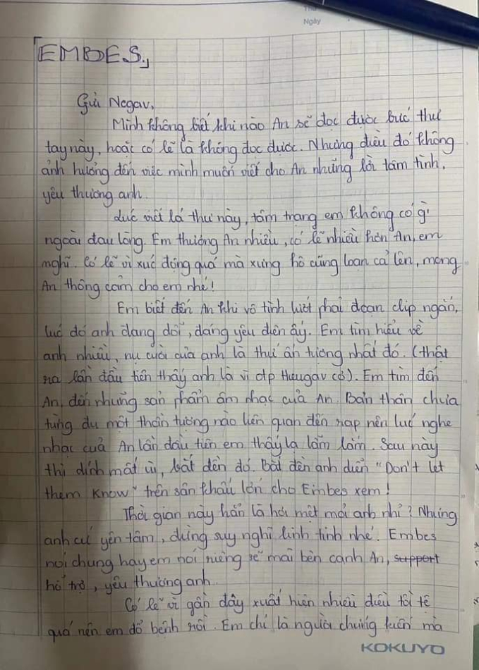 Giữa những ồn ào bủa vây, chủ nhân bức thư gửi lời động viên Negav: “Thời gian này hẳn là hơi mệt mỏi anh nhỉ? Nhưng anh cứ yên tâm, đừng suy nghĩ linh tinh nhé. Embes nói chung hay em nói riêng sẽ mài bên cạnh An, hỗ trợ, yêu thương anh. Có lẽ vì gần đây xuất hiện nhiều điều tồi tệ quá nên em đổ bệnh rồi. Em chỉ là người chứng kiến mà đó như thế, em lo lắm, liệu anh sẽ thế nào đây bạc, trước kia một ngày không đăng status vui Embes đã lo sốt vó, réo anh khắp nơi rồi. Mà hiện tại, em chẳng dám đòi hỏi, gọi anh như trước. Negav, em chỉ mong rằng anh vẫn ổn thôi.