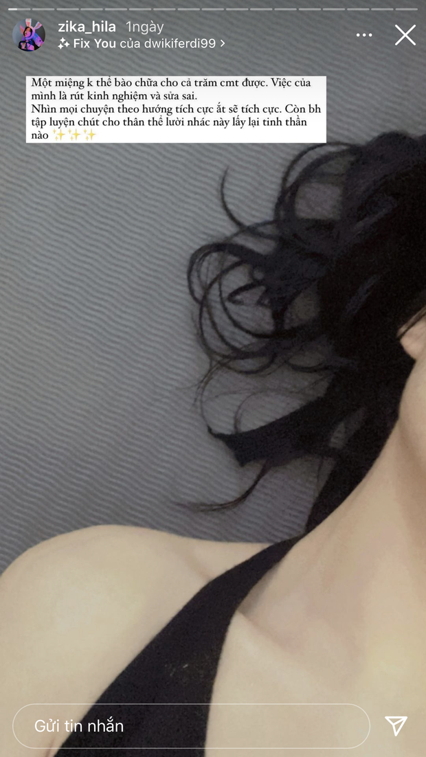 Ngoài ra trên trang cá nhân, Zika cũng đăng story động viên bản thân trước tình huống này, khẳng định sẽ suy nghĩ tích cực, rút kinh nghiệm và sửa sai vì hành động trước đây.