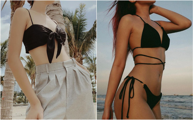 Cùng tạo dáng nghiêng với bikini, cùng đeo kính, các bạn thấy thấy Linh Chi (trái) và Kiều Ly Phạm (phải) có giống "chị em sinh đôi" không