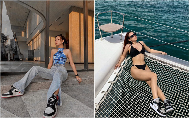 Tạo dáng với sneaker để show đôi chân dài xem chừng cũng là điểm chung của hai gái xinh