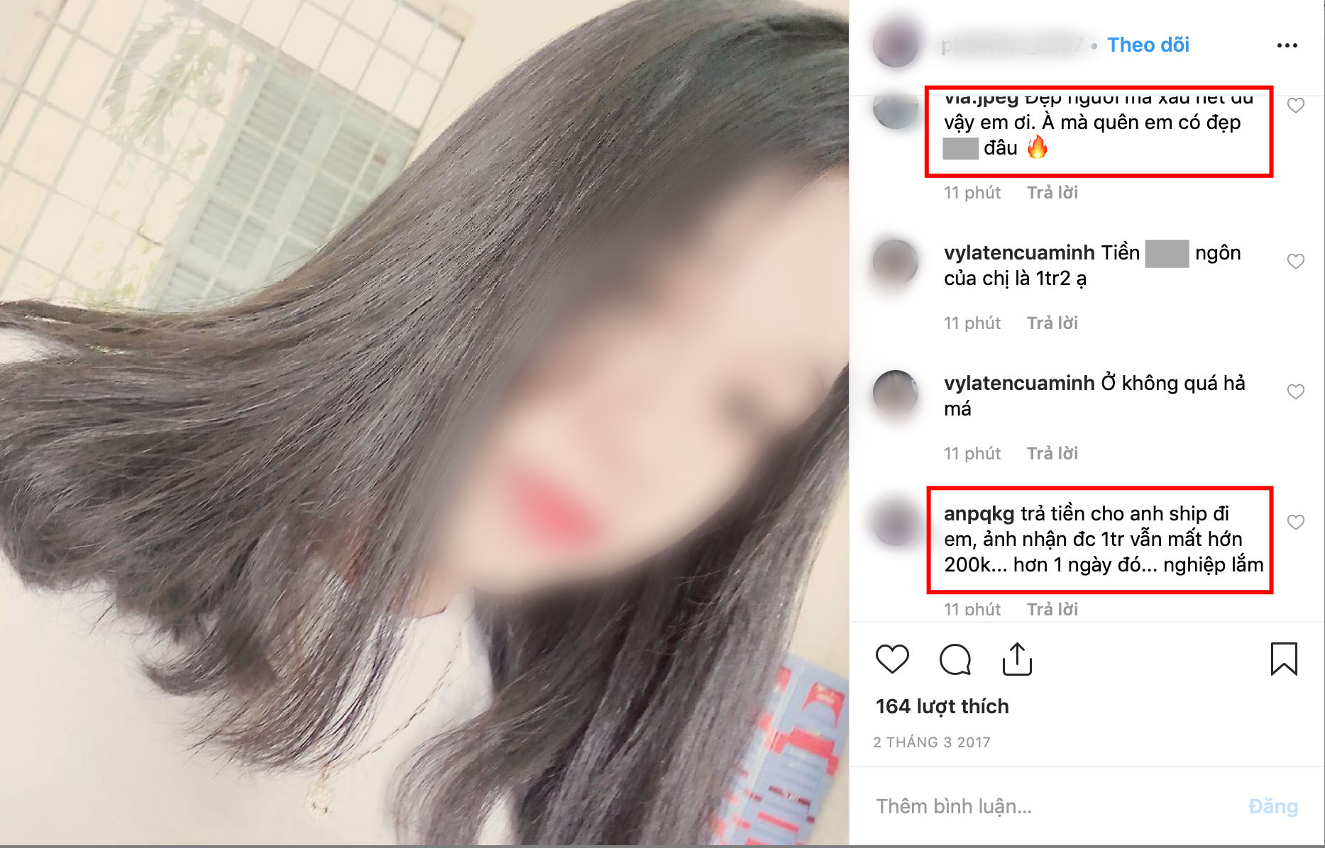 Câu chuyện về cô gái "boom" hàng kể trên hiện đang khiến cộng đồng mạng hết sức bất bình. Như thường lệ, dân tình đã nhanh chóng tìm ra thông tin của "nữ chính" bao gồm các tài khoản mạng xã hội như Facebook và Instagram, để lại rất nhiều bình luận tiêu cực tỏ ý phẫn nộ, đồng thời chỉ trích hành động quá đáng của cô dành cho shipper.
