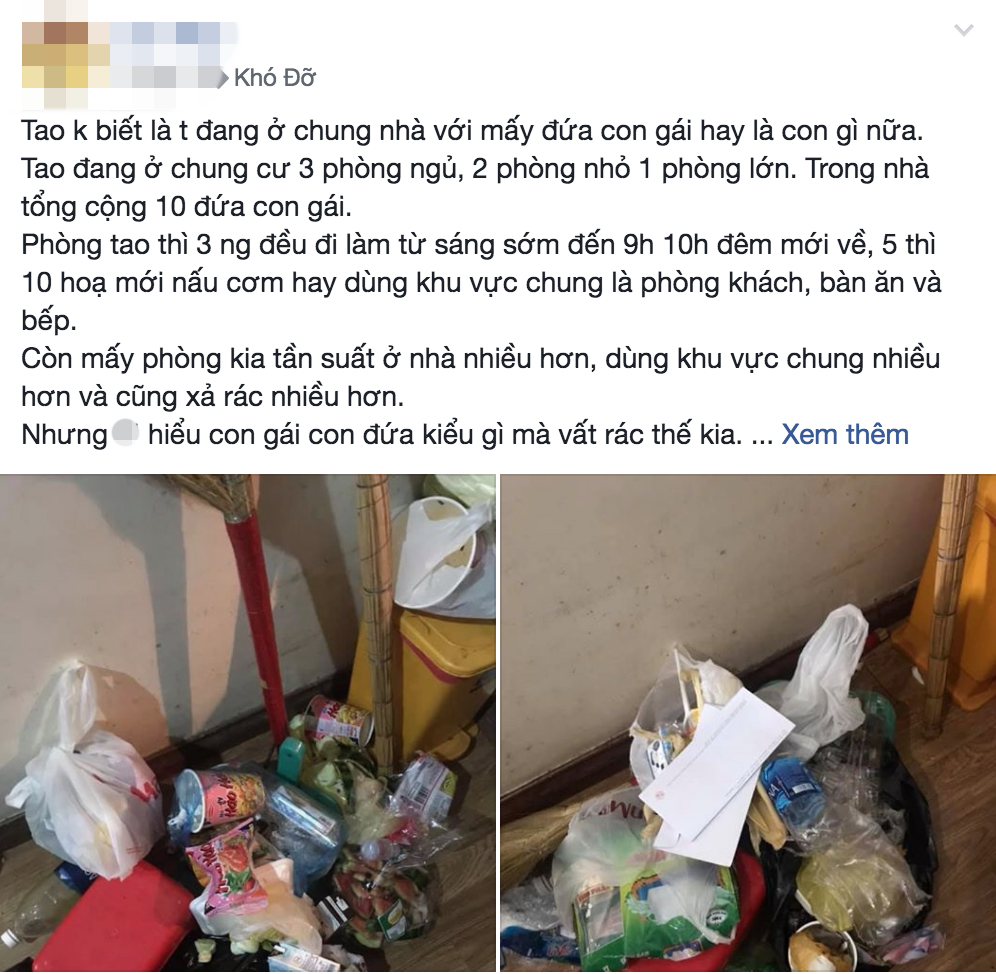 "Mình không biết là mình đang ở chung nhà với mấy đứa con gái hay là con gì nữa. Mình đang ở chung cư 3 phòng ngủ, 2 phòng nhỏ 1 phòng lớn. Trong nhà tổng cộng 10 đứa con gái. Phòng mình thì 3 người đều đi làm từ sáng sớm đến 9h, 10h đêm mới về, 5 thì 10 hoạ mới nấu cơm hay dùng khu vực chung là phòng khách, bàn ăn và bếp. Còn mấy phòng kia tần suất ở nhà nhiều hơn, dùng khu vực chung nhiều hơn và cũng xả rác nhiều hơn. Nhưng không hiểu con gái con đứa kiểu gì mà vất rác thế kia.