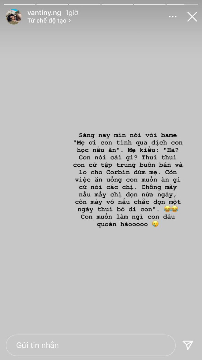 Hoá ra Vân Tiny muốn đi học nấu ăn nhưng mẹ Fabo Nguyễn lại khuyên bỏ đi vì cần gì đã có người giúp việc trong nhà nấu. Hơn nữa cô chỉ cần tập trung buôn bán và chăm sóc con trai - Corbin là đủ.