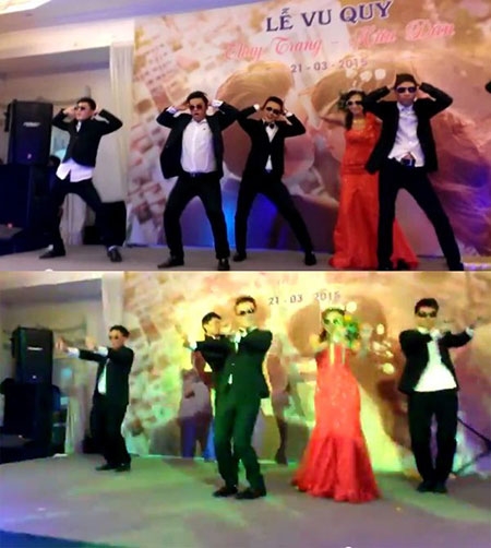 Một đoạn clip về màn vũ đạo cực sôi động và vui nhộn ngay trong Lễ vu quy của đôi vợ chồng trẻ đang được cộng đồng mạng thích thú chia sẻ trên facebook. Trong clip quay lại đám cưới vào ngày 21/3, cô dâu, chú rể cùng những người bạn của họ đã đeo cặp kính đen và "quẩy" cực sung từ các điệu nhảy Michael Jackson, Gangnam Style, Gentleman, thậm chí cả Vũ điệu cồng chiêng cũng được thể hiện rất đồng đều trên sân khấu.