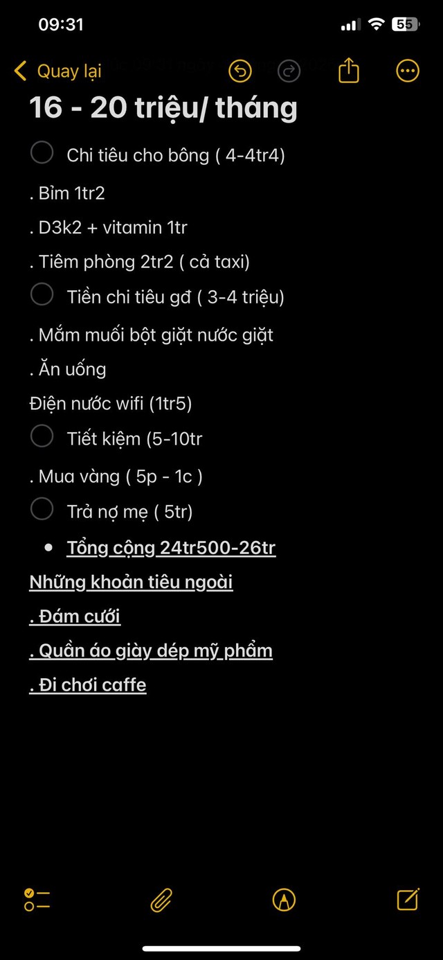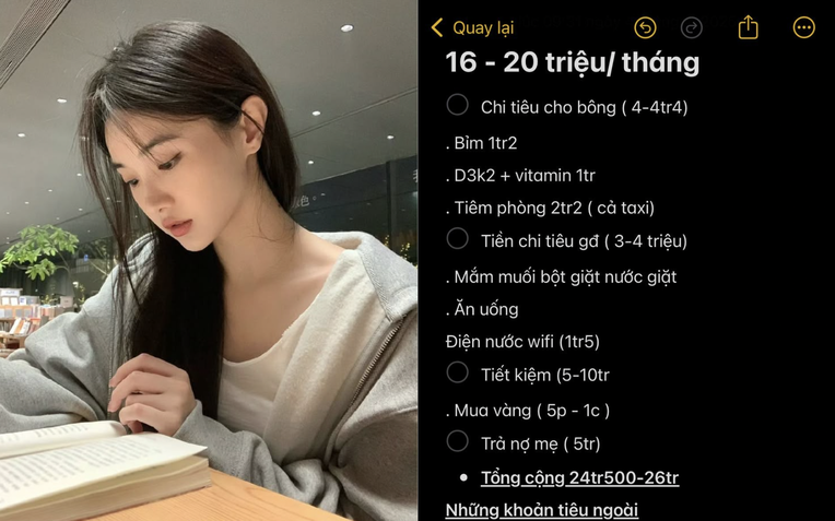 Tổng cộng: 24,5-26 triệu. Những khoản tiêu ngoài (đám cưới, quần áo, giày dép, mĩ phẩm, đi chơi, cà phê)".