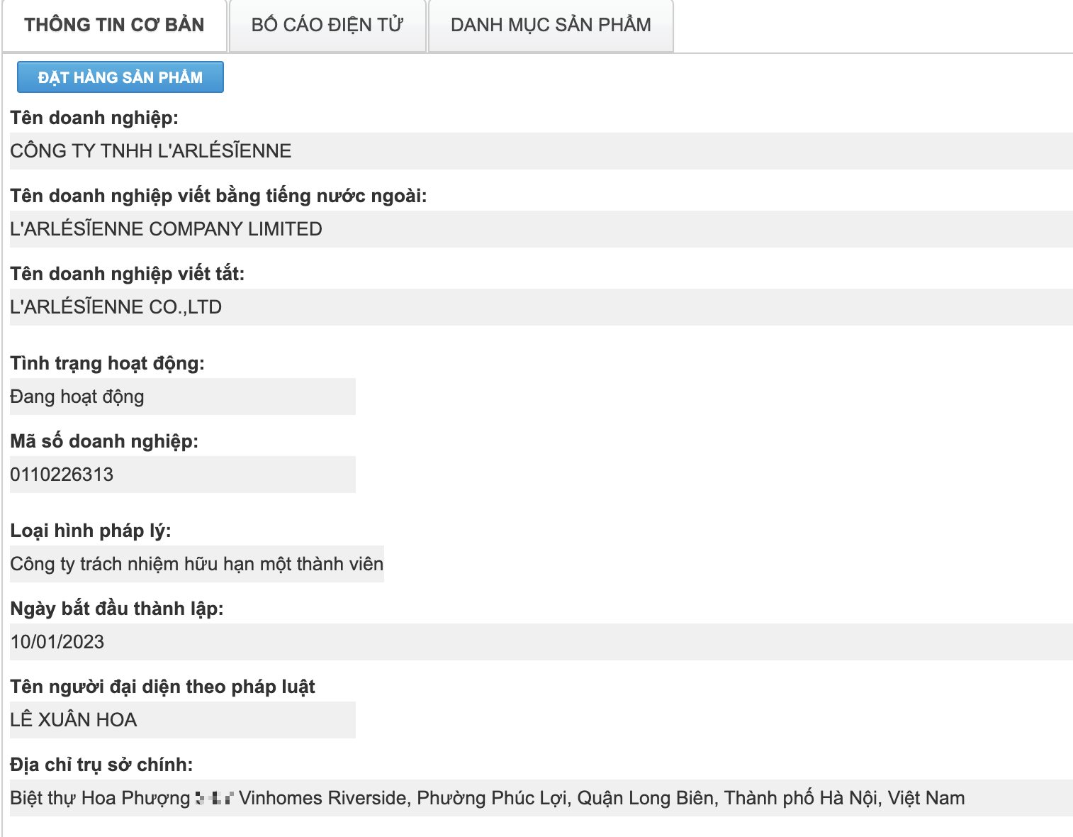 L'ARLÉSĪENNE có tên đầy đủ là Công ty TNHH L'ARLÉSĪENNE, được thành lập ngày 10/1/2023. Lucas cho biết do chưa đủ tuổi, công ty lấy tên mẹ em làm người đại diện theo pháp luật.