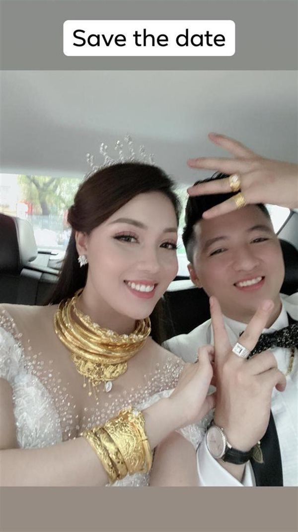 Ở diễn biến khác, nữ giảng viên xinh đẹp khiến nhiều người xuýt xoa khi chia sẻ hình ảnh đeo vàng trĩu cổ và kín tay nhận được trong ngày cưới.