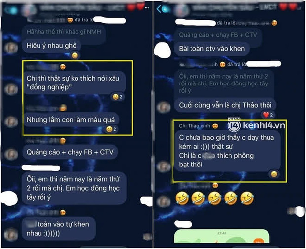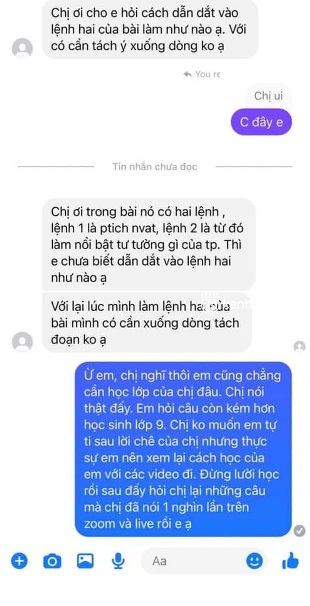 Nữ sinh H.T (trường THPT Chu Văn An, Hà Nội) cho hay: "Mình biết đến cô khi lướt mạng xã hội thì thấy các bài đăng quảng cáo. Mình đã đóng học được 2 lần với tổng chi phí là 1,1 triệu đồng. Tuy nhiên khi theo học rồi mình thấy kiến thức ít, mỗi buổi livestream chưa đến 1 tiếng trong khi bọn mình chỉ được học 15/60 buổi online. Nhiều lần mình nhắc cô về giờ học lẫn lịch dạy thì bị cô quát mắng, còn dọa sẽ cho mình out nhóm nếu mình ý kiến nhiều lời".