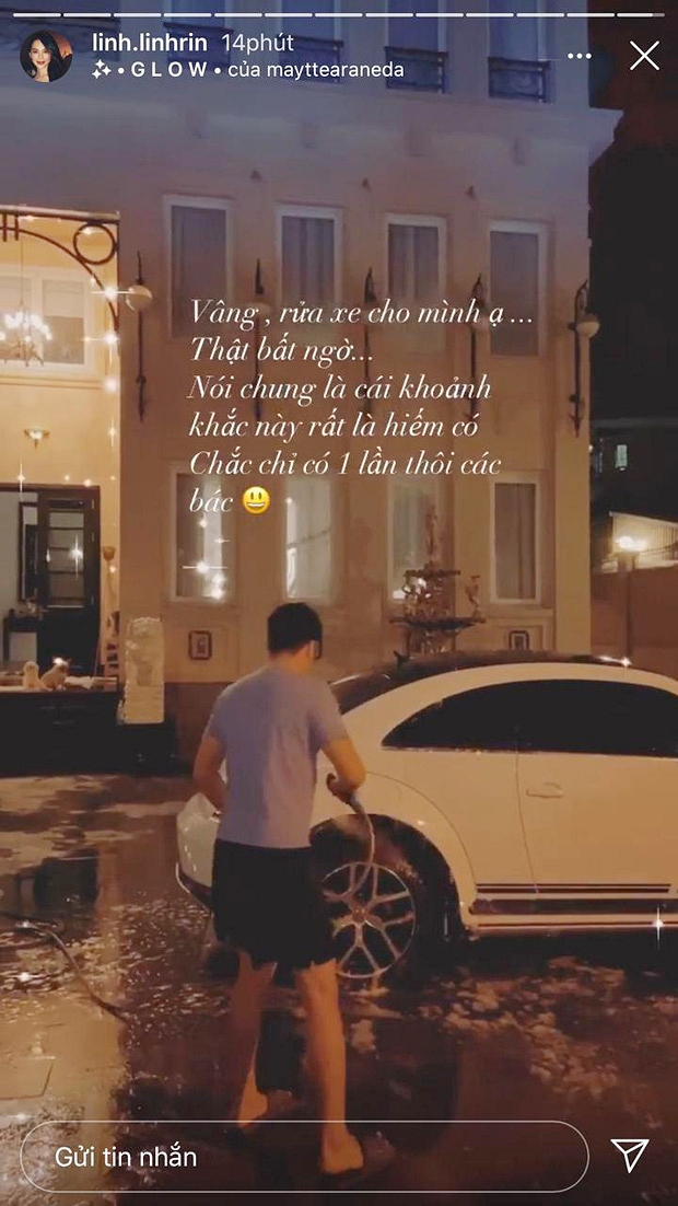 Không chỉ ủng hộ sở thích ăn uống của Linh Rin, Phillip Nguyễn cũng rất chiều chuộng bạn gái xinh đẹp khi xắn tay làm đủ thứ vì cô. Mới hôm qua, nàng hot girl 9X khiến chị em hờn đến đỏ mắt khi khoe khoảnh khắc hiếm hoi Phillip Nguyễn tự tay rửa xe cho cô ngay trước sân nhà. Hình ảnh tổng tài lịch lãm quen thuộc của anh chàng được thay thế bằng bộ quần đùi áo phông khá trẻ trung, cầm vòi nước chăm chú rửa xe cho bạn gái. Thử hỏi có mấy chàng thiếu gia nhà giàu dám làm một việc bình thường giản dị như thế cho người yêu khi hoàn toàn có thể mang xe ra tiệm để rửa!