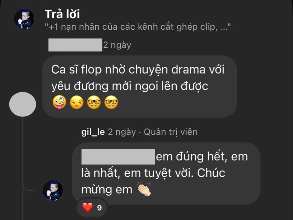 Tuy nhiên, giữa làn sóng ủng hộ, vẫn xuất hiện một bình luận tiêu cực cho rằng Gil Lê “flop” trong nghệ thuật và chỉ nổi tiếng nhờ chuyện tình cảm. Đối diện với sự công kích, Gil Lê không né tránh mà chọn cách phản hồi thẳng thắn nhưng đầy châm biếm: “Em đúng hết, em là nhất, em tuyệt vời. Chúc mừng em”.