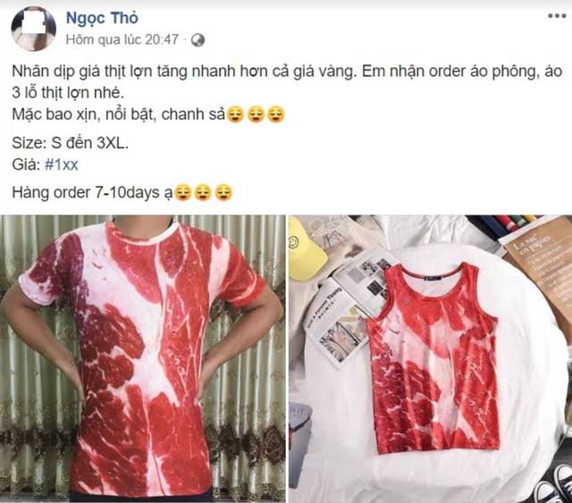 Chuyện thịt heo tăng giá trở thành đề tài bàn tán sôi nổi, nhất là khi dịp tết Nguyên đán đang đến gần. Kéo theo đó là hàng loạt các câu chuyện về thịt heo, trong đó xuất hiện thời trang "in hình thịt heo tươi" đang gây bão với giới trẻ nước ta.