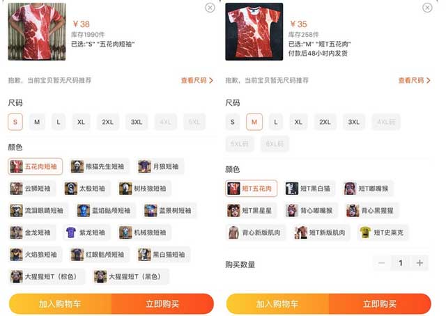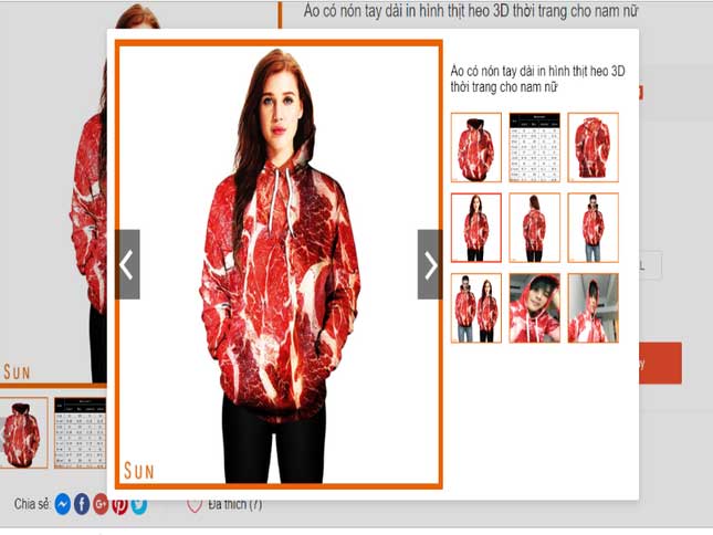 Tại sàn TMĐT Tabao, một chiếc áo in hình thịt heo tươi có giá 35-40 nhân dân tệ, tương đương khoảng 115.000-130.000 đồng, chưa bao gồm thuế phí và cước vận chuyển.