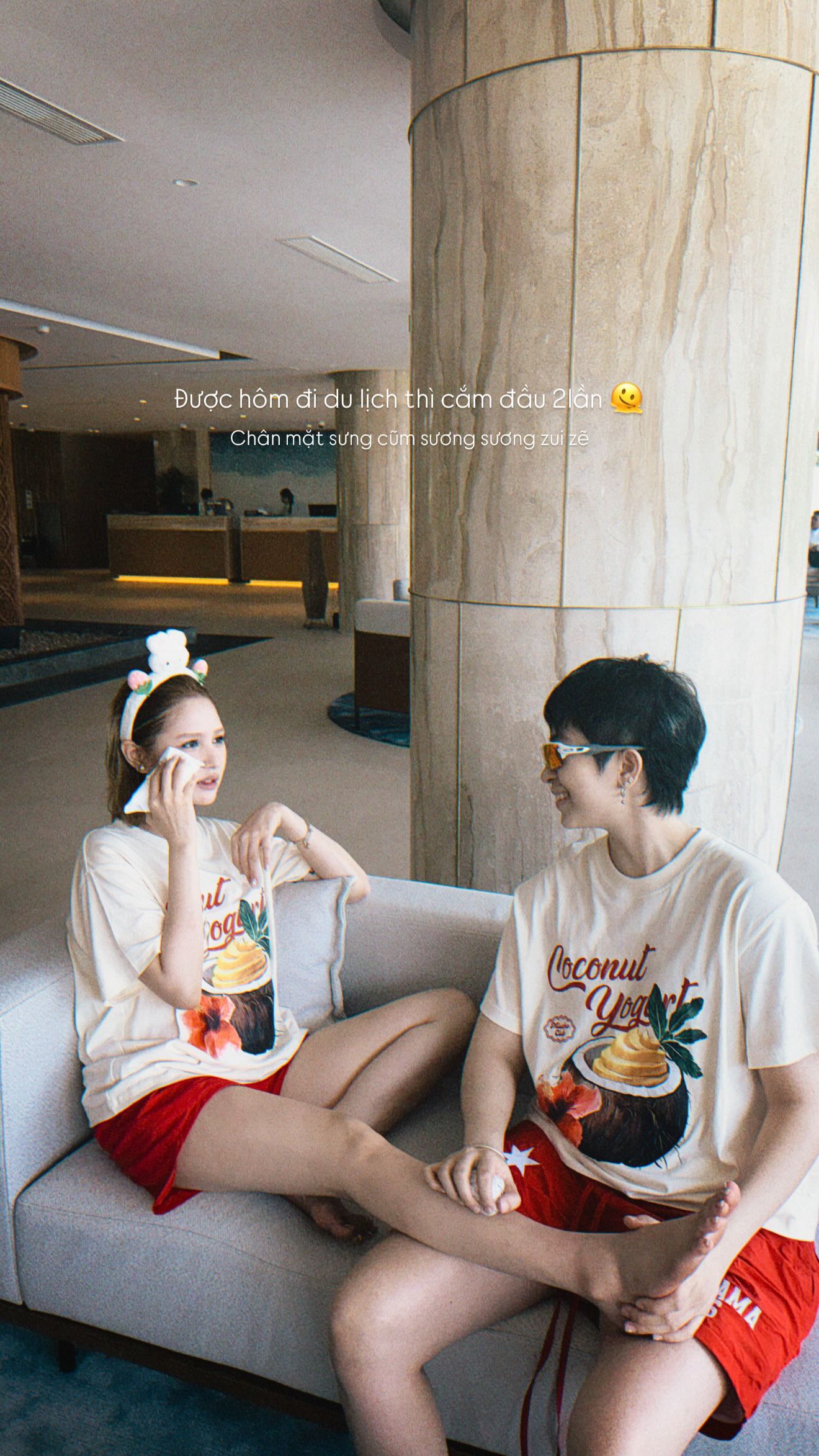 Trong một story khác của Xoài Non, cô nàng cho biết đi du lịch nhưng ngã 2 lần, vừa sưng chân vừa sưng mặt. Cùng với đó là hình ảnh Gil Lê mặc đồ đôi với Xoài Non, đang bóp chân cho người yêu.