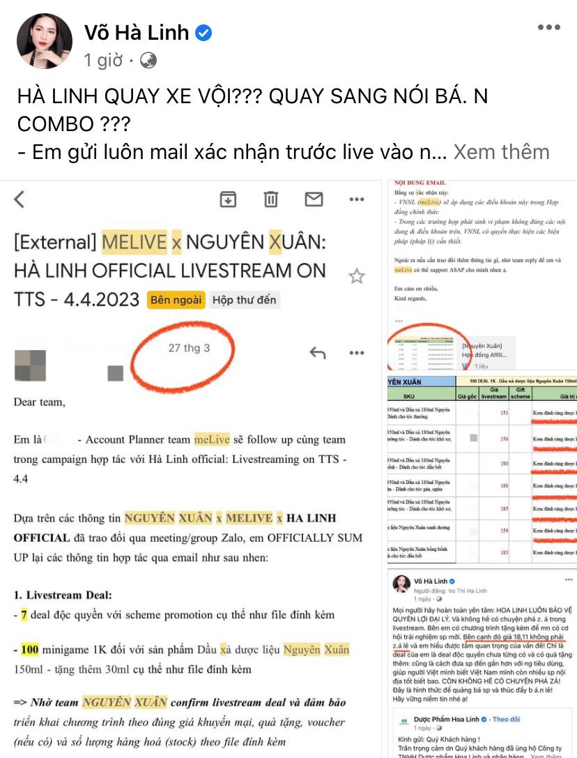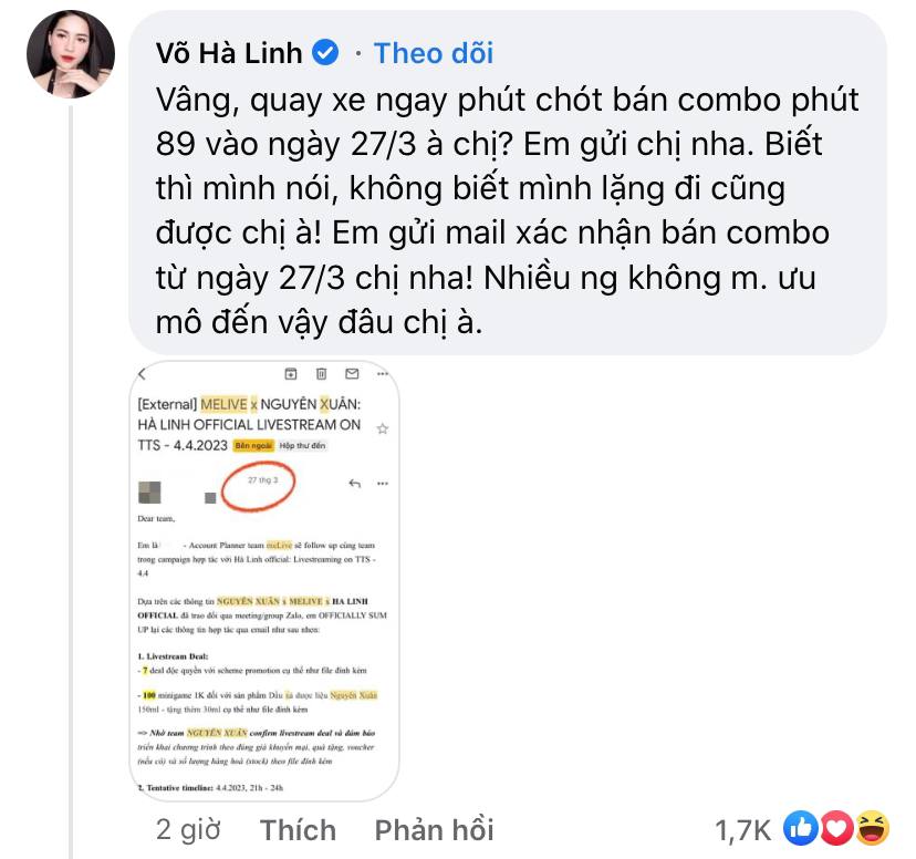 Gọi đích danh Diệu Thúy trên trang cá nhân là chưa đủ, Hà Linh còn vào tận bài viết của cô nàng để đối chất: "Vâng, qua xe ngay phút chót bán combo phút 89 ngày 27/3 à chị? Em gửi chị nha. Biết thì mình nói, không biết thì mình lặng đi cũng được chị à! Em gửi mail xác nhận bán combo từ ngày 27/3 chị nha! Nhiều người không mưu mô đến vậy đâu chị à".