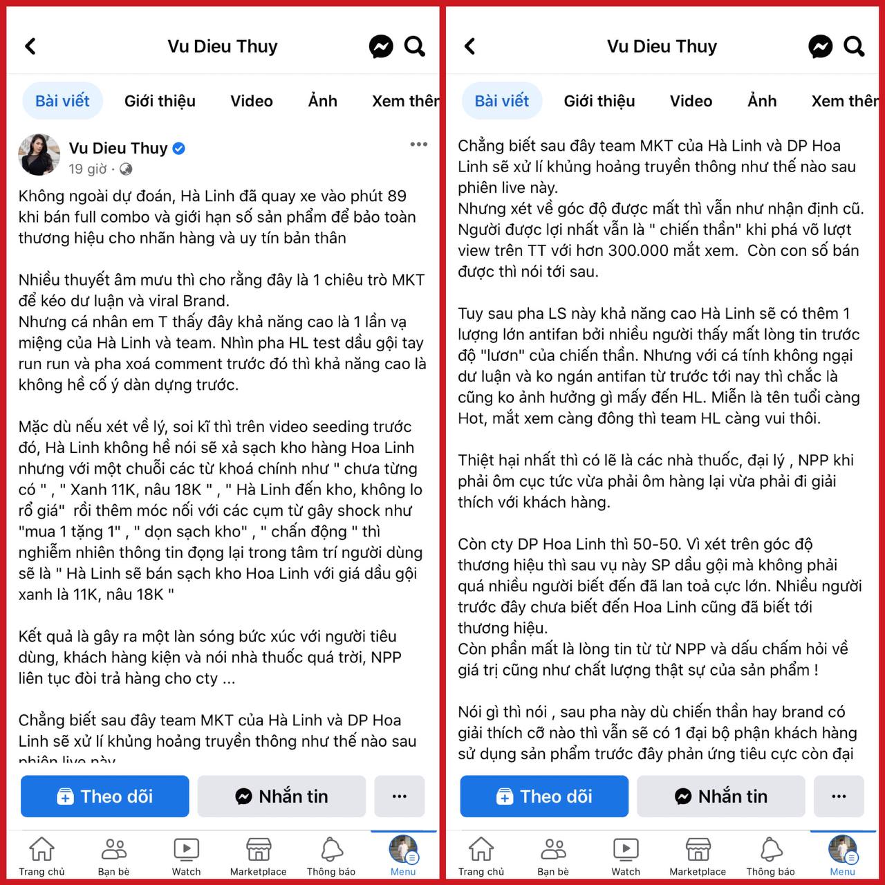 Nguồn cơn của sự bực tức này xuất phát từ bài viết dài của Diệu Thúy được đăng tải vào hôm qua (4/4), phân tích theo góc nhìn cá nhân về việc "Hà Linh quay xe vào phút 89 khi bán full combo và giới hạn số sản phẩm để bảo toàn thương hiệu cho nhãn hàng và uy tín cho bản thân". Nữ doanh nhân còn đưa ra thuyết âm mưu, cho rằng đây là chiêu trò marketing để câu kéo dư luận và tăng độ nhận diện, phủ sóng cho nhãn hàng.