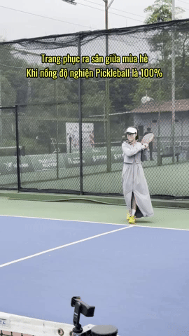 Giữa ồn ào thời trang Pickleball, dân tình lại hào hứng với video một cô gái mặc áo chống nắng dài dù trời tối đi tập Pickleballl. Trong video được chia sẻ trên mạng xã hội, một người đàn ông tại câu lạc bộ còn đặt câu hỏi “mặc kín mít thế này đã đủ uy tín chưa”.