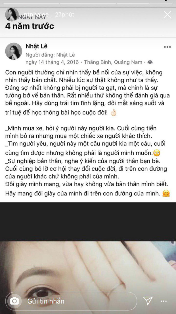 Dù bài viết này được cô nàng đăng tải cách đây rất lâu nhưng nhiều người cho rằng chắc hẳn Nhật Lê đang có những cảm xúc tương tự nên cô mới chia sẻ lại như thế. Thêm vào đó, dạo gần đây cô nàng cũng thường có những status cổ vũ bản thân mạnh mẽ, bản lĩnh trước sóng gió.