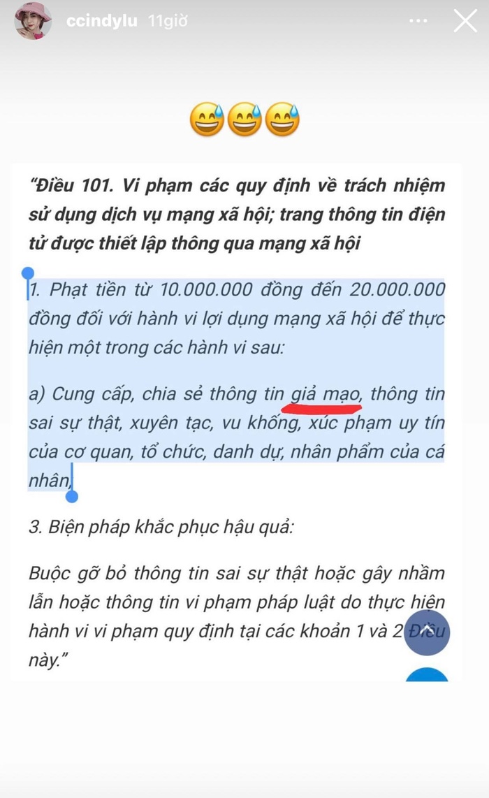 Giữa lúc bị réo gọi trên khắp diễn đàn về drama trên, Cindy Lư có động thái gây chú ý. Trên Instagram, cô đã đăng tải một đoạn trích trong bộ luật với nội dung nói về những thông tin giả mạo, sai sự thật. Ngoài ra, khi lợi dụng mạng xã hội để thực hiện các hành vi giả mạo thông tin này cũng sẽ bị phạt ở các mức từ 10 đến 20 triệu đồng.