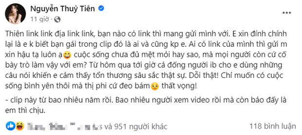 "Thiên link link địa link link, bạn nào có link thì mang gửi mình với. Em xin đính chính lại là em không biết bạn gái trong clip đó là ai và cũng không phải em. Ai có link của mình thì gửi em xin hậu tạ luôn ạ".