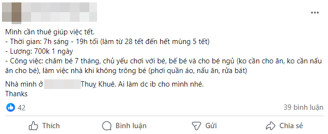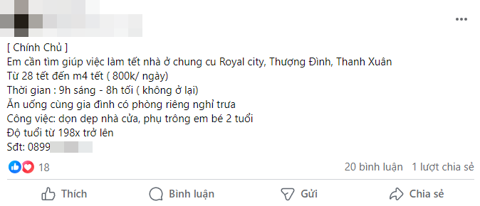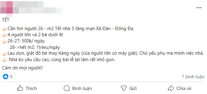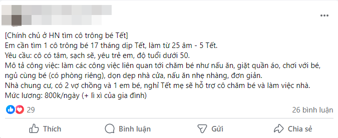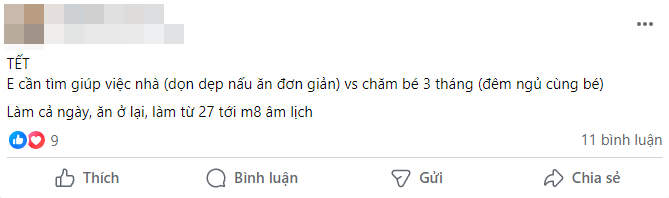 Dạo một vòng MXH sẽ thấy hội mẹ bỉm đang nháo nhào tìm người giúp việc cho chục ngày Tết với mức lương rơi vào khoảng 800-hơn 1 triệu/ngày. Bỏ ra số tiền không nhỏ nên các mẹ cũng mong sẽ tìm được người giúp việc có tâm. Vì họ cũng không về với gia đình nên cũng sẽ lì xì thêm chút ít vào ngày mùng 1.