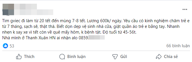 "Thật sự tìm giúp việc gian nan lắm mọi người, chỉ mong tìm được người hợp. Ở với nhau tầm 1 tuần thôi nên cứ nhẹ nhàng, yêu thương nhau là tốt lắm rồi. Mình cũng thương mấy bác không có người thân, hoặc có nhưng muốn ở Hà Nội kiếm thêm. Ngày Tết sum vầy mà họ lẻ loi cũng tội lắm, nên cũng động viên, tiền lương thêm chút cũng là bình thường, quan trọng là tìm được người tốt", chị Hoa (sống tại Hà Nội) chia sẻ.