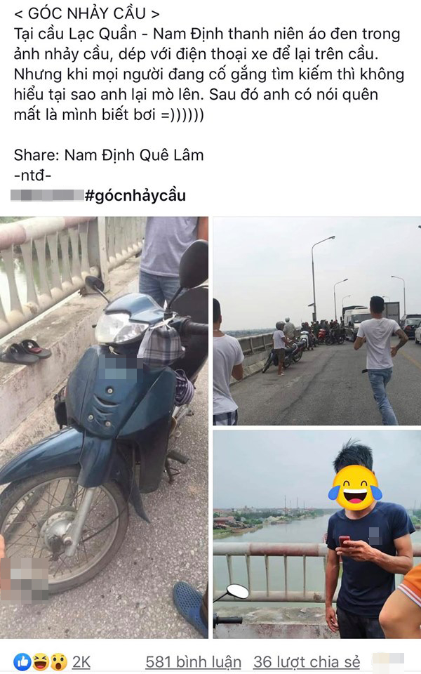 Được chia sẻ trên mạng xã hội, câu chuyện xảy ra tại cầu Lạc Quân - Nam Định đã thu hút nhiều sự chú ý của cộng đồng mạng. Theo đó, thanh niên mặc áo đen có ý định nhảy cầu tự tử. Anh ta đã để lại dép, điện thoại và xe trên cầu để thực hiện ý nghĩ của mình.