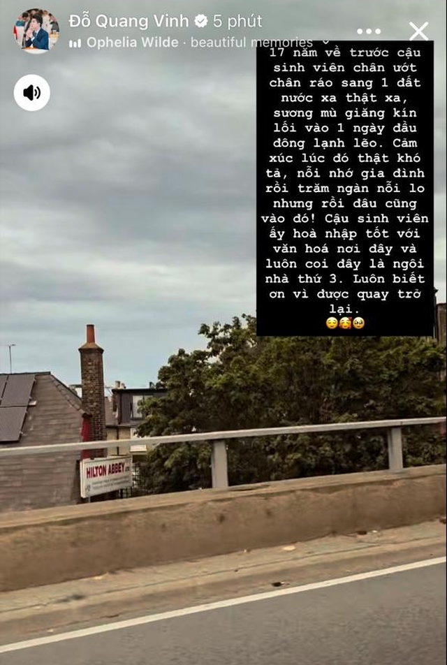 Duới bầu trời xanh, mây trắng, hai doanh nhân trẻ đứng cạnh nhau tựa vào lan can, sau lưng là cầu Tháp London (Tower Bridge) hiện lên phía xa. Đỗ Quang Vinh và Đỗ Vinh Quang đều ăn mặc thoải mái, phong cách trẻ trung, và tận hưởng chuyến du lịch cùng nhau.