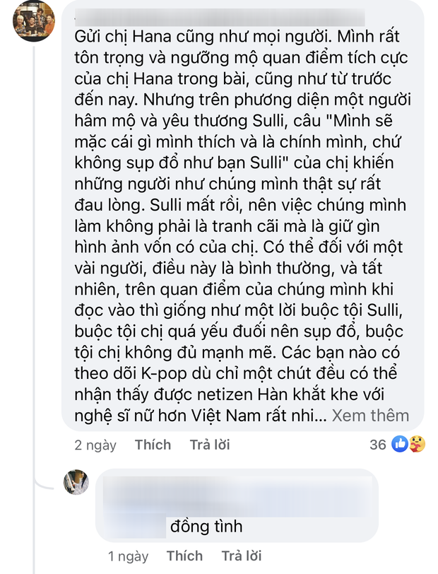 Cách nói của Hana Giang Anh dễ bị hiểu nhầm rằng chỉ vì một nguyên nhân "thả rông" mà Sulli bị tấn công dẫn đến quyên sinh.