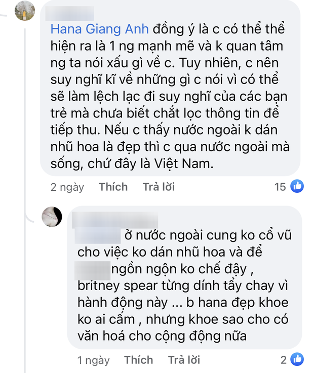 Bên cạnh những comment khen ngợi thì cũng xuất hiện những bình luận trái chiều về hình ảnh "thả rông" này của nữ HLV. Không hài lòng với một số comment "thiếu duyên dáng", Hana đã lên Faceook viết hẳn một status dài để bảo vệ quan điểm nữ giới nên yêu cơ thể của mình và không vì nhận xét của bất cứ ai mà thiếu tự tin, nếu bạn không thích mặc áo ngực thì đừng mặc.