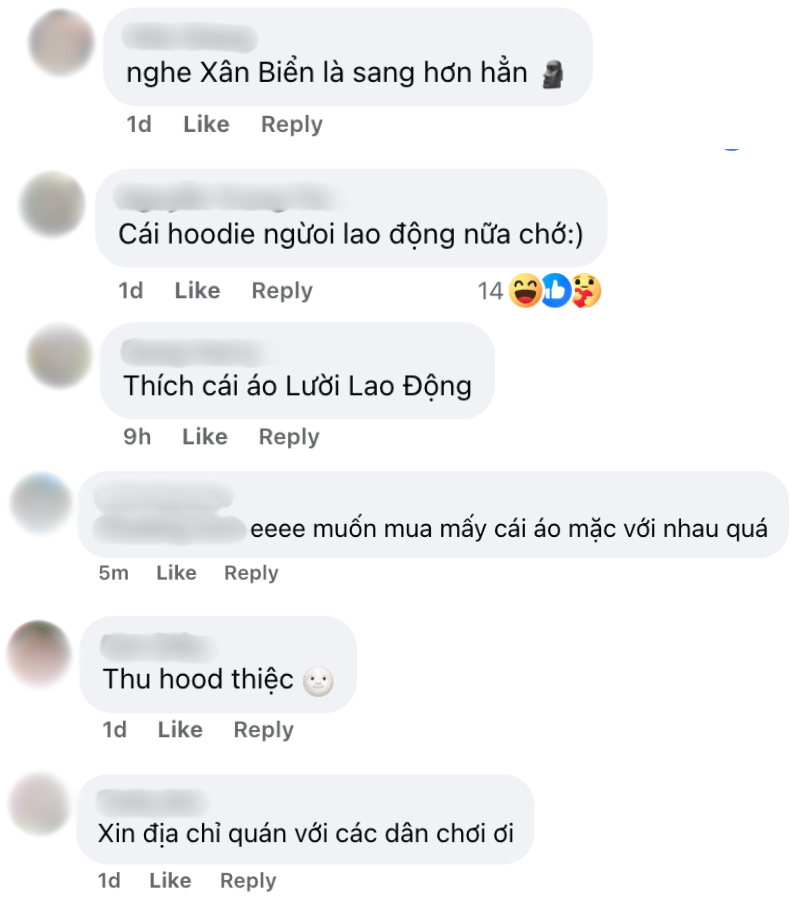 "Xin địa chỉ quán với", "Thích cái áo Lười Lao Động", "Thu hood thiệt", "Muốn mua mấy cái áo mặc với nhau quá"...